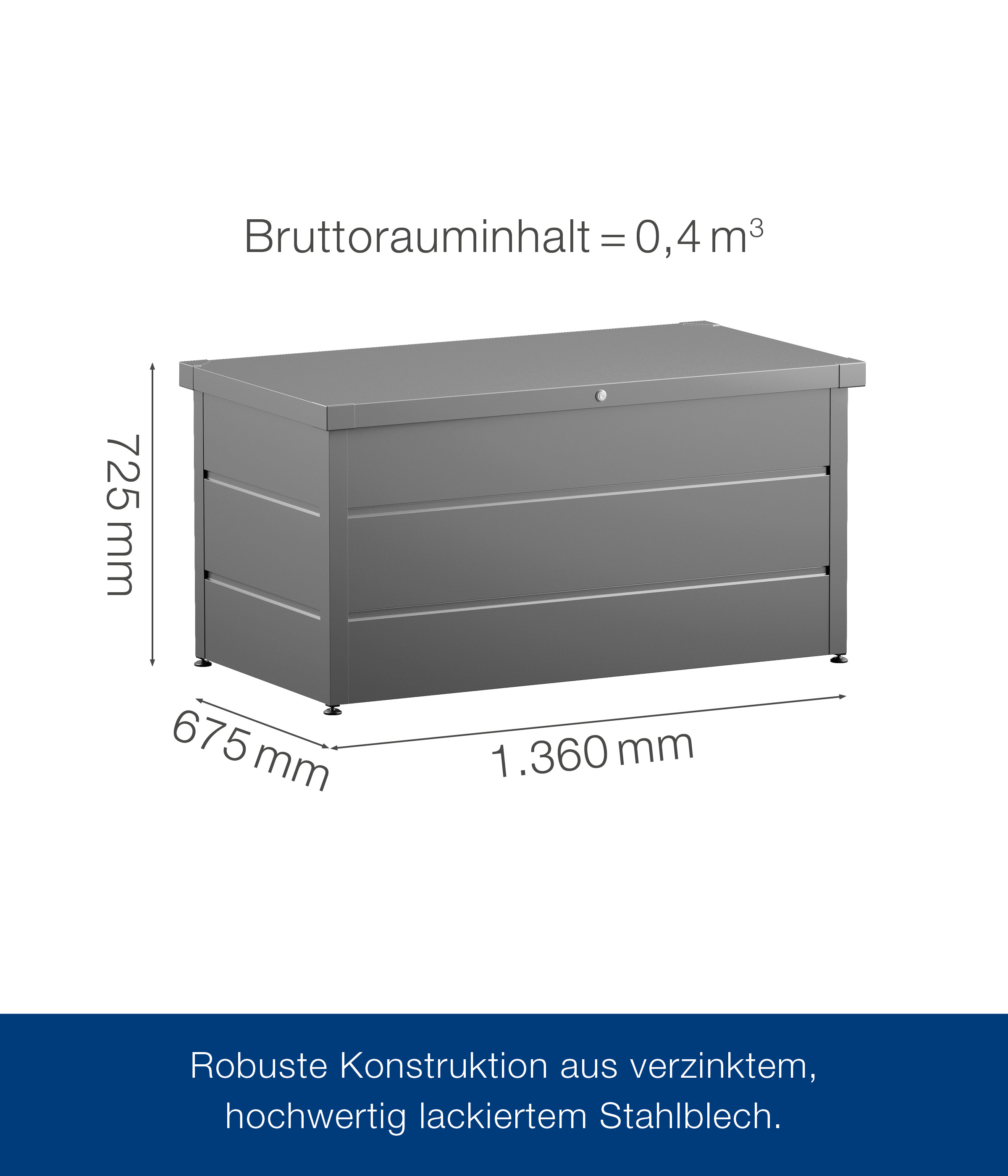 Außenmaße mit Deckel: 1.360×675×725 mm (B×T×H). RAL 9007 Graualuminium. Öffnen und Schließen dank zwei integrierten Dämpfern. Witterungsbeständig, regenwasserdicht und UV-beständig.
