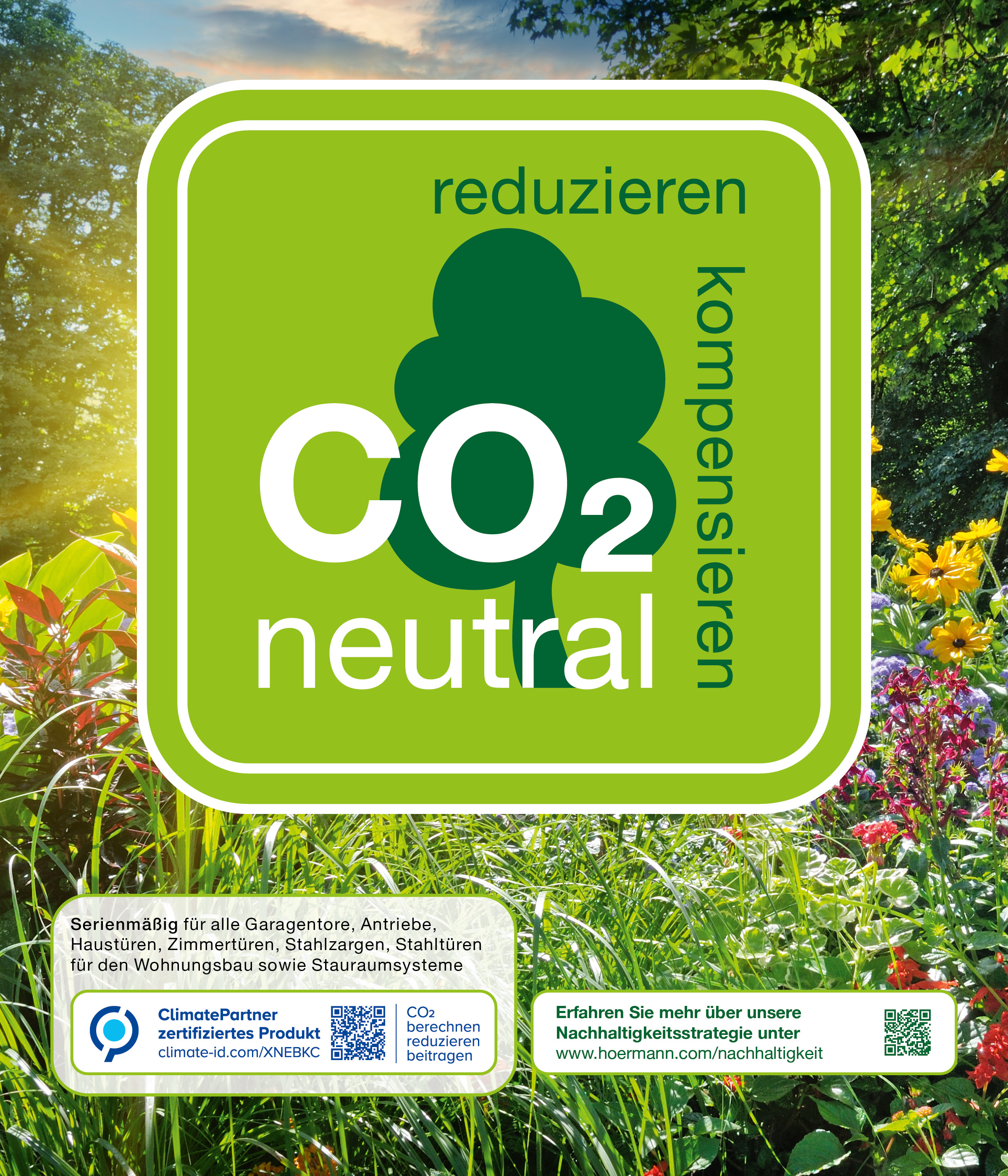 Als Familienunternehmen ist Hörmann sich seiner Verantwortung für nachfolgende Generationen bewusst und bieten alle Produkte für den Wohnungsbau serienmäßig CO2-neutral an. Hörmann verfolgt mit der Nachhaltigkeitsstrategie das Ziel, Emissionen zu reduzieren und zu vermeiden.