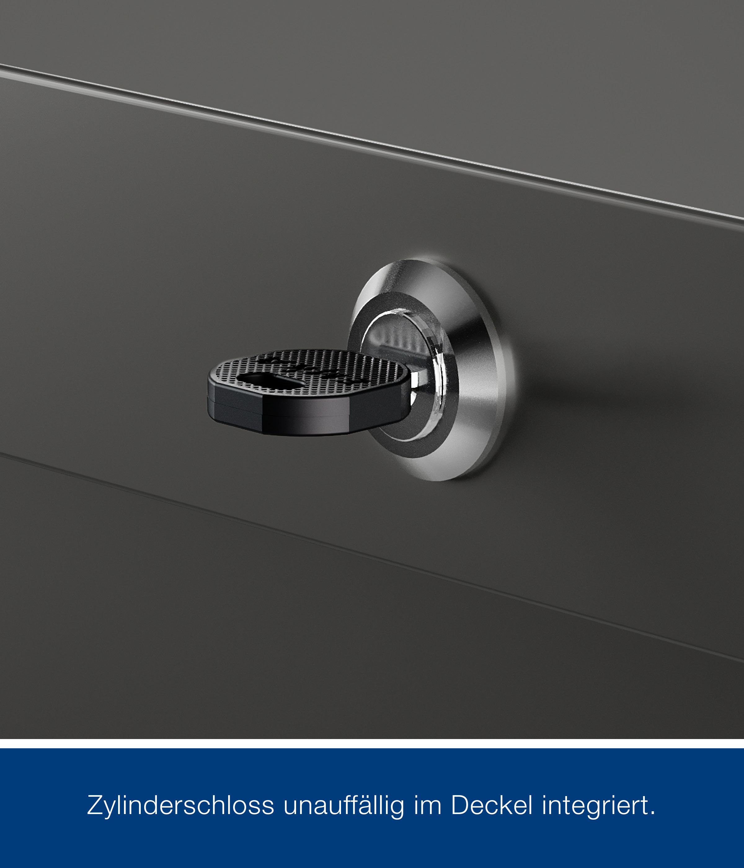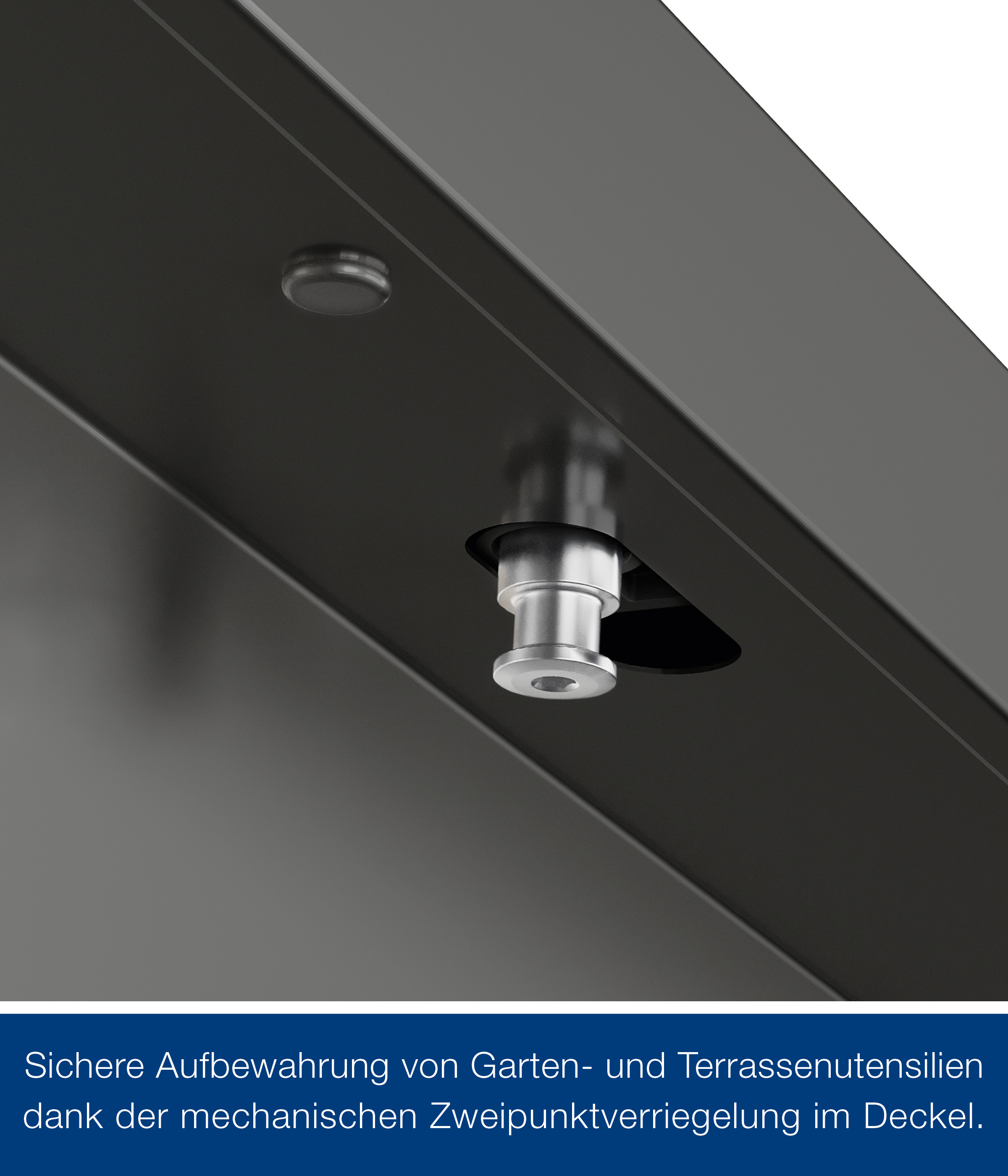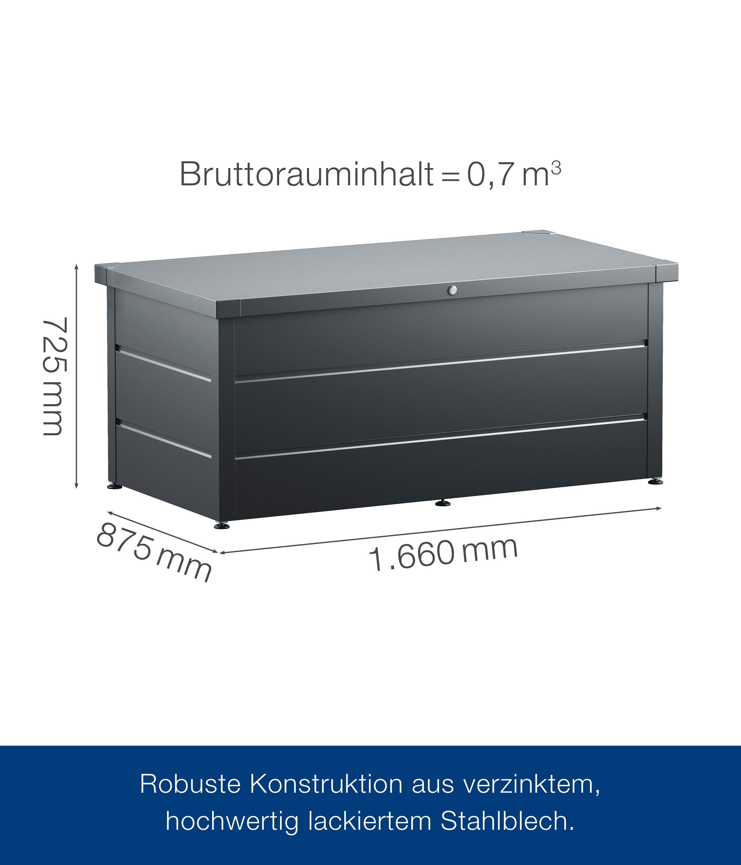 Außenmaße mit Deckel: 1.660×875×725 mm (B×T×H). RAL 7016 Anthrazitgrau. Komfortables Öffnen und Schließen dank zwei integrierten Dämpfern. Witterungsbeständig, regenwasserdicht und UV-beständig.