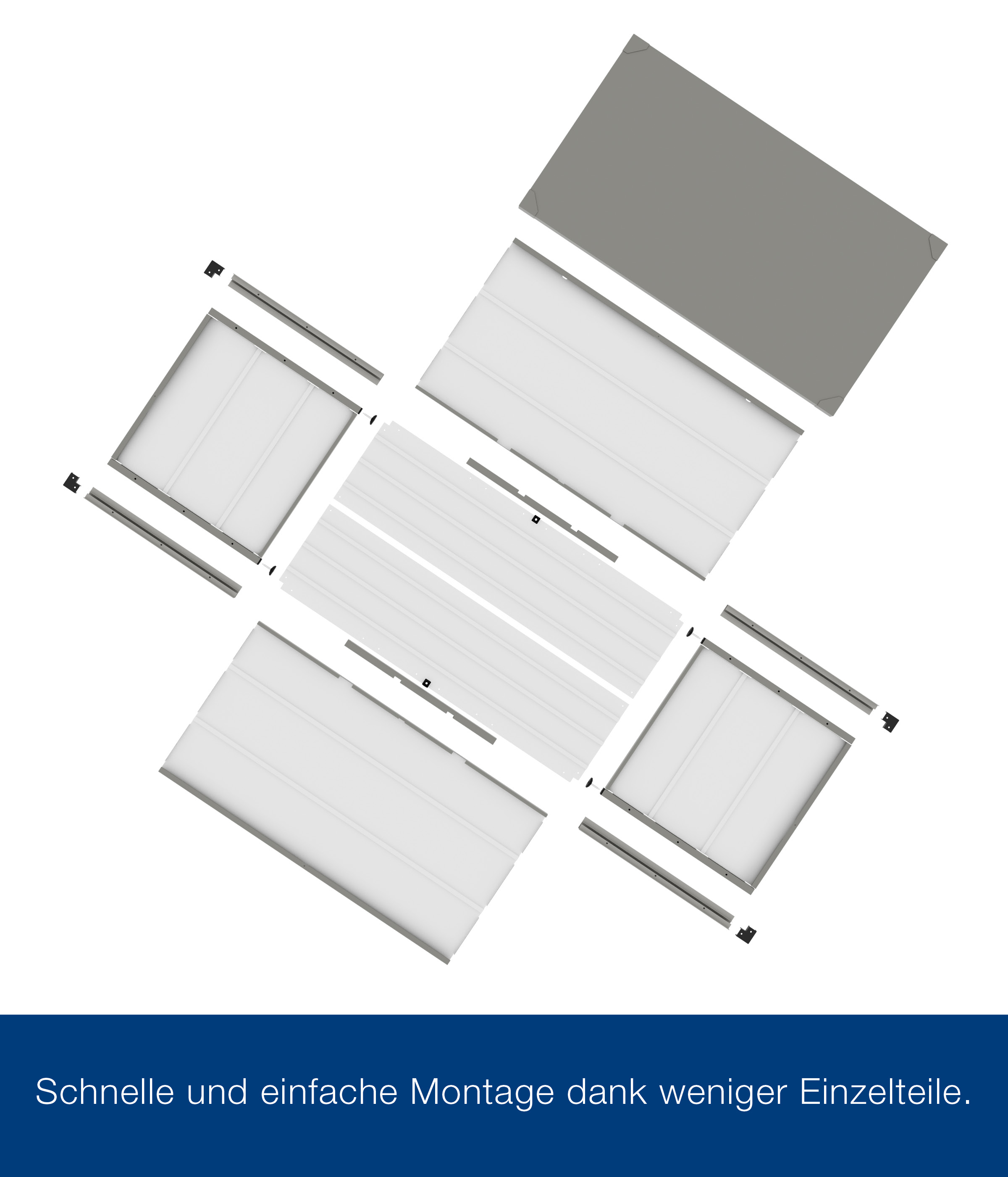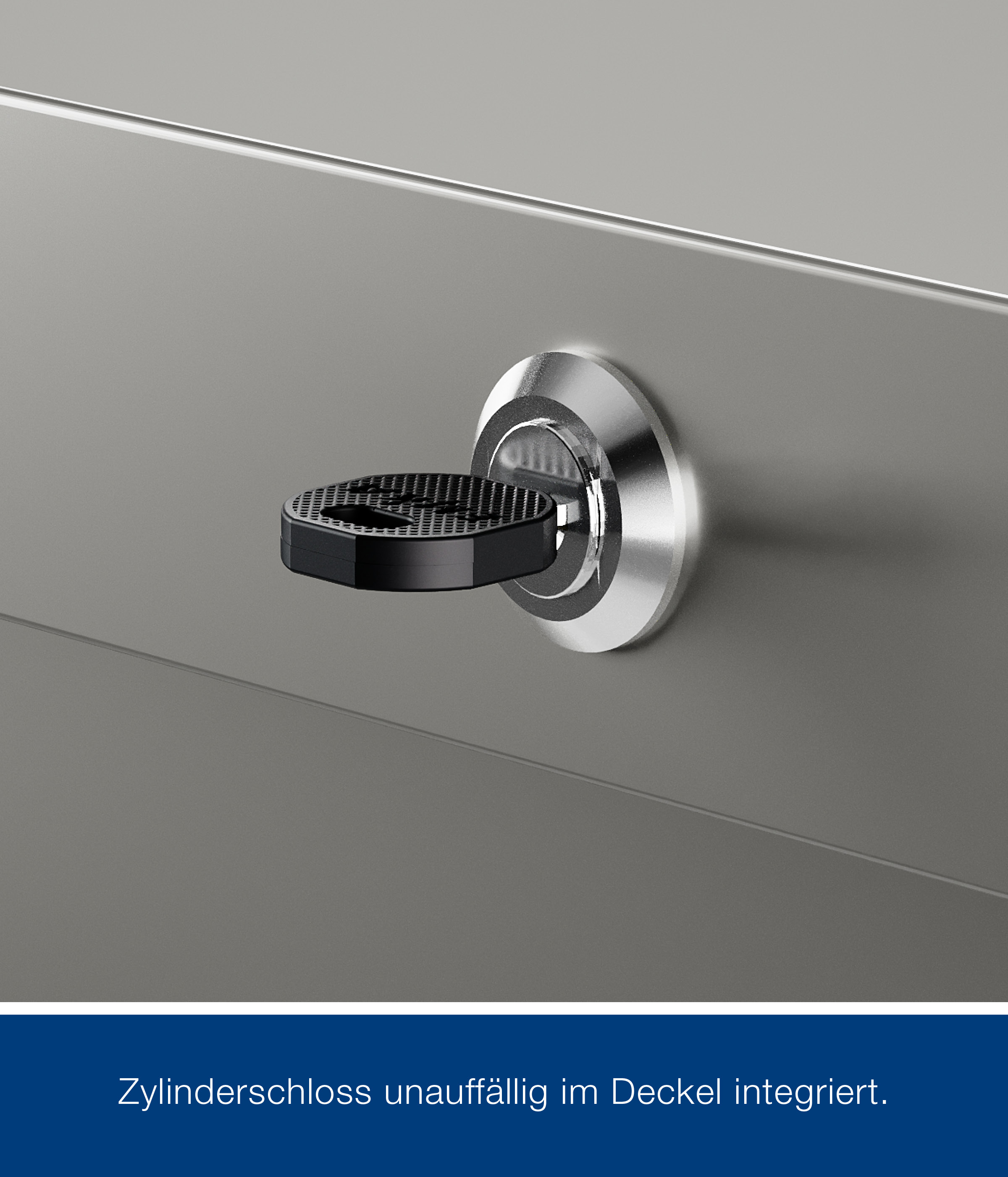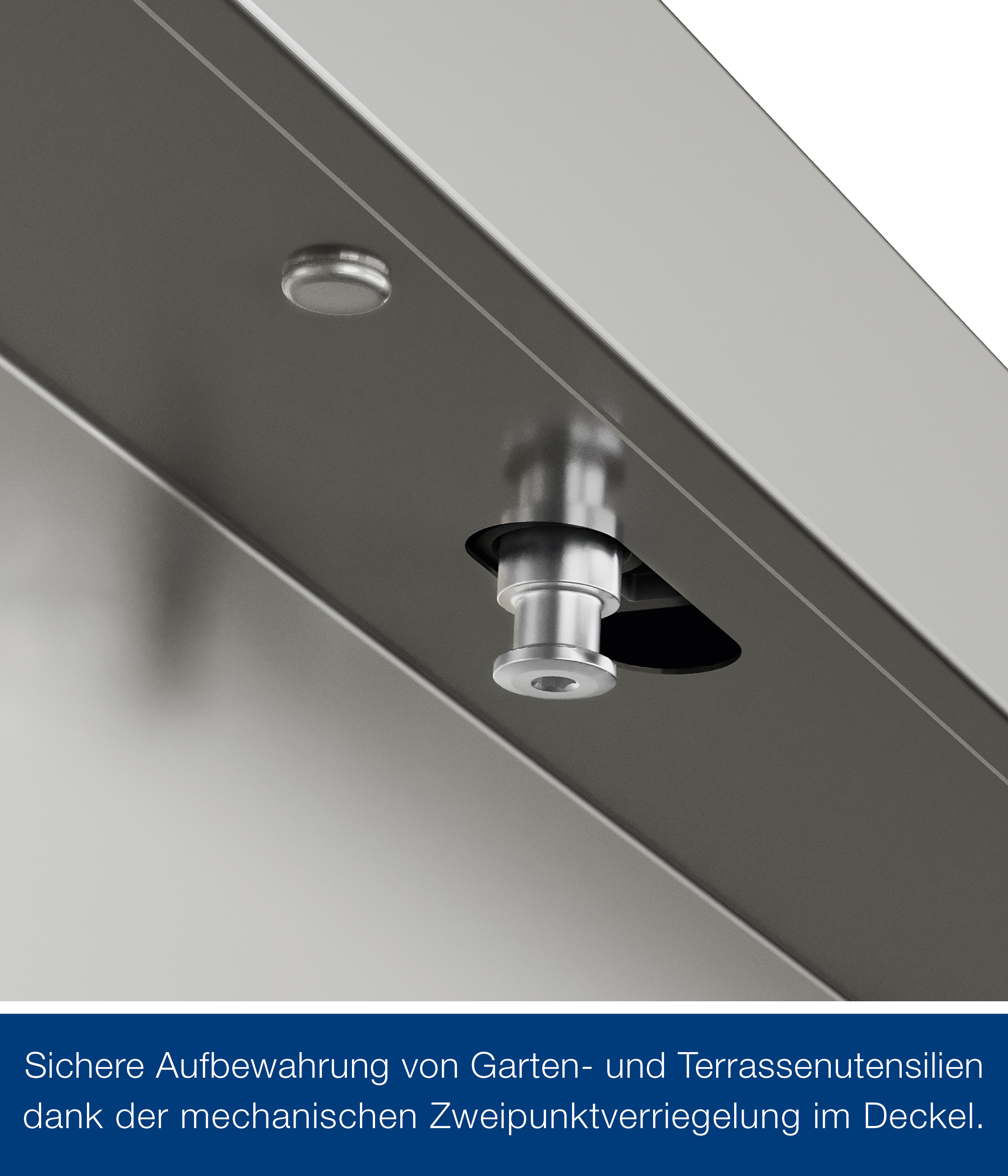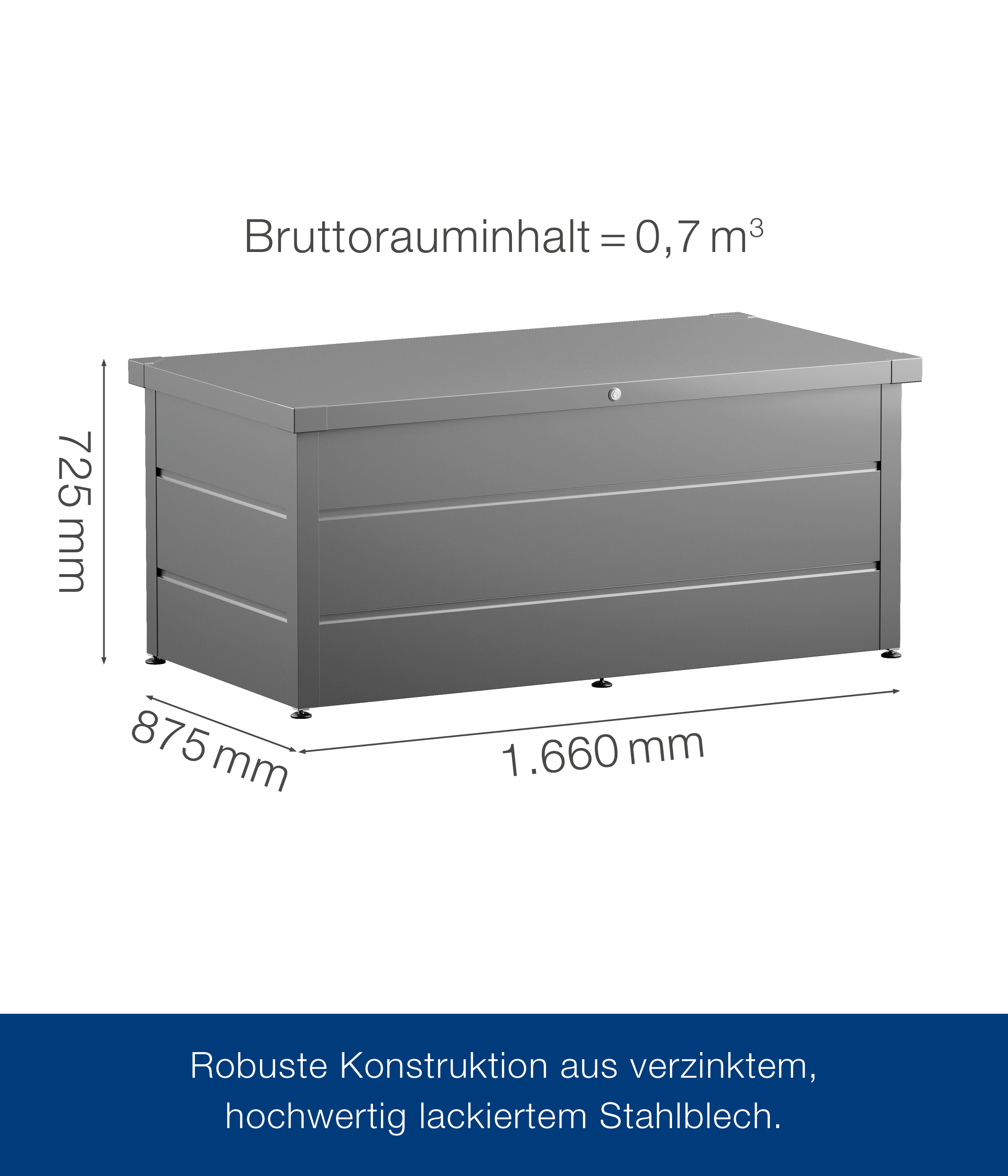 Außenmaße mit Deckel: 1.660×875×725 mm (B×T×H). RAL 9007 Graualuminium. Komfortables Öffnen und Schließen dank zwei integrierten Dämpfern. Witterungsbeständig, regenwasserdicht und UV-beständig.