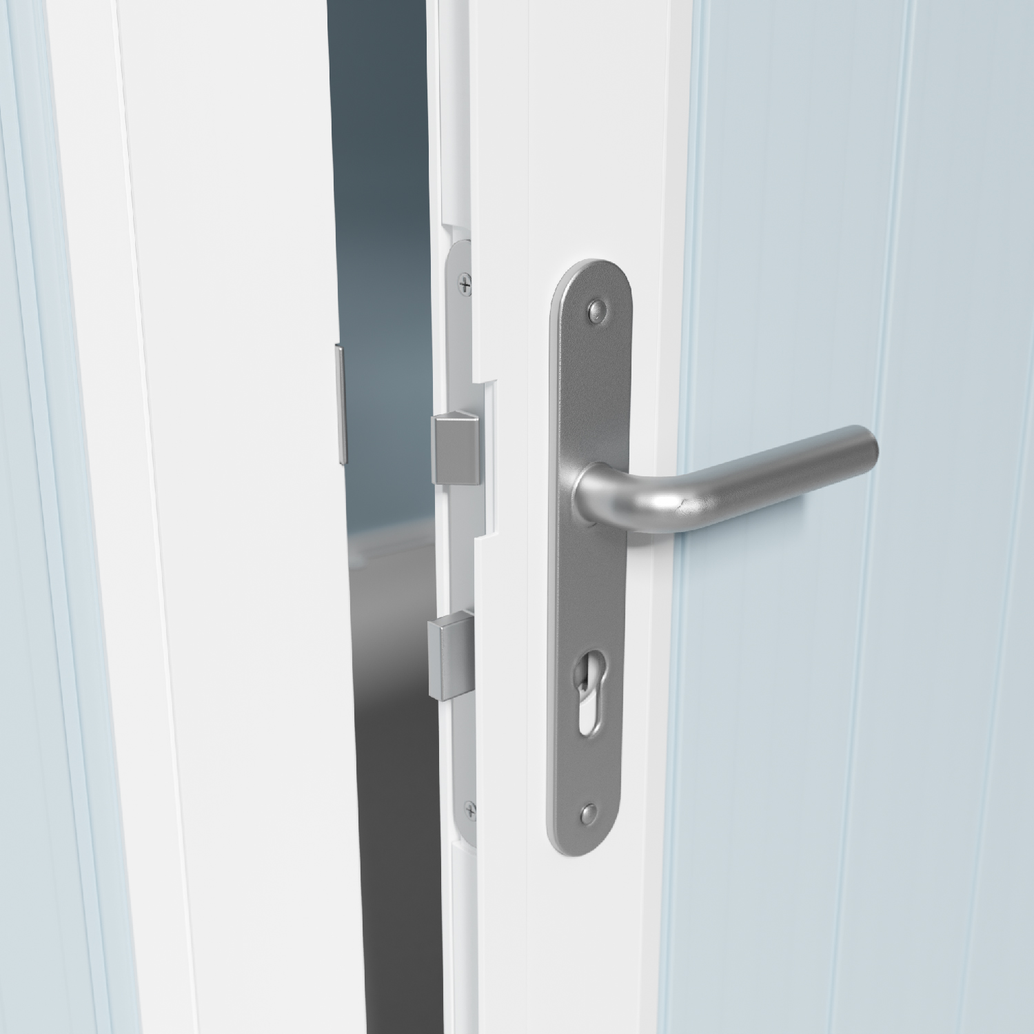 - Türausstattung: Drückergarnitur aus Edelstahl, BB-Schloss mit 2 Schlüsseln