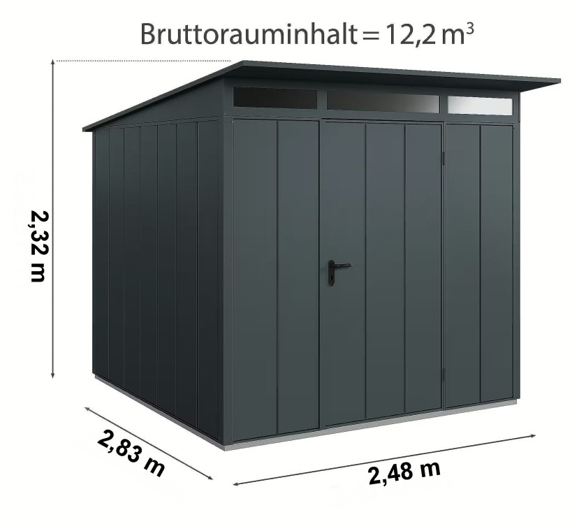 - Außenmaße mit Dachüberstand: 2479 × 2834 mm (BxT)