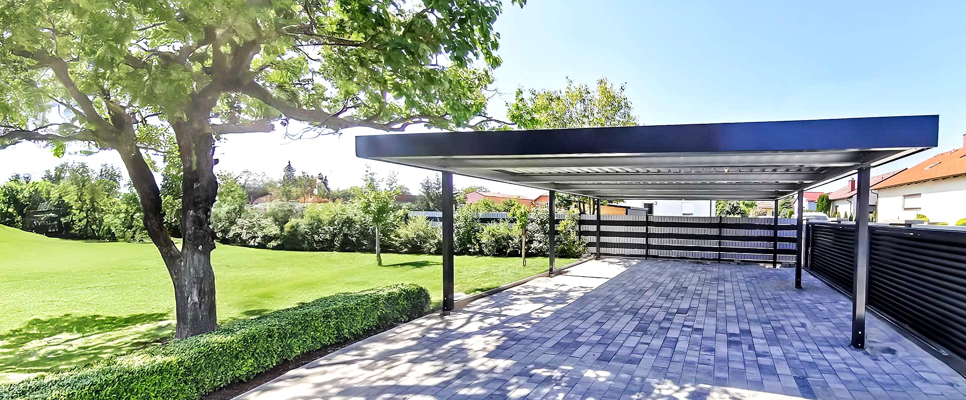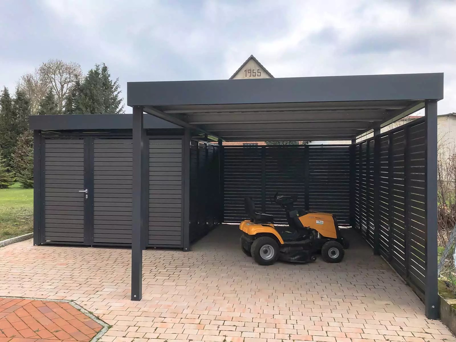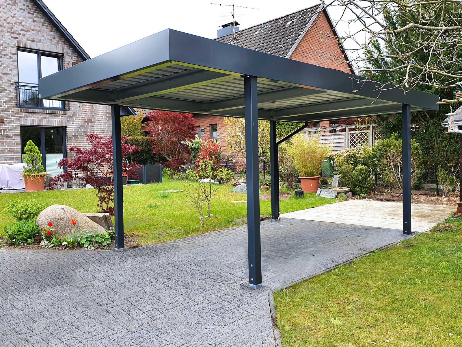 Schlanke Stützen und ein in Optik und Funktion genau abgestimmtes Dach. Mehr braucht es im Grunde genommen nicht, um ein Fahrzeug unterzustellen. Die Stützen sind in der Standardvariante hinten und vorne ca. 1,10 m eingerückt.
