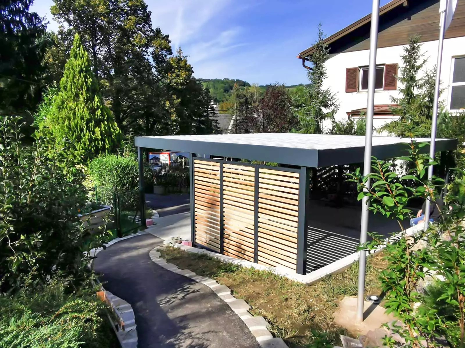 Carports mit Sichtschutzelementen. Die Wandelemente des Carports bieten Schutz vor neugierigen Blicken und schaffen optische wie räumliche Trennung. Auch als Terrassenüberdachung und Freisitz im Garten werden Carports immer beliebter!