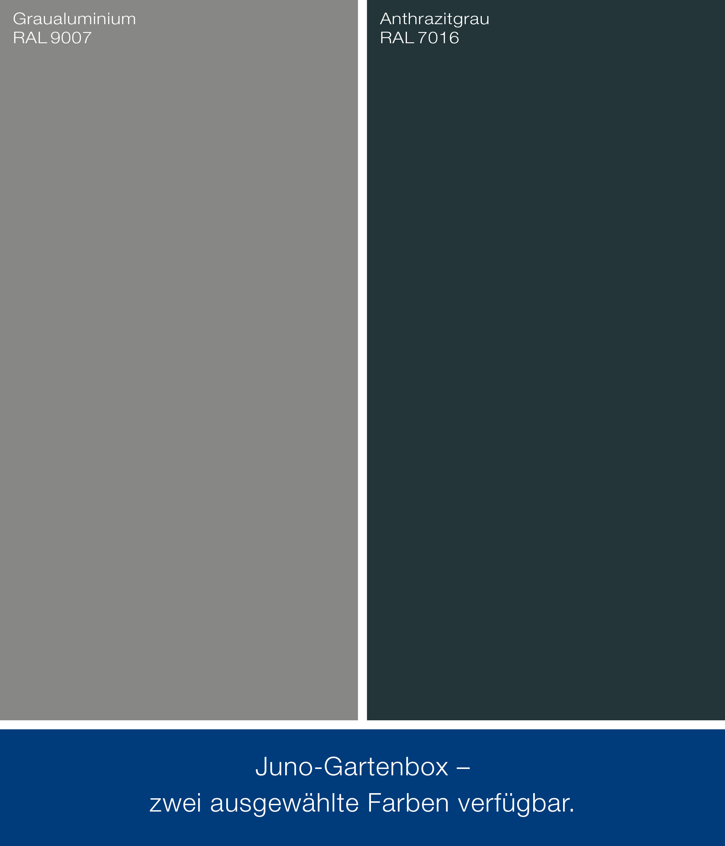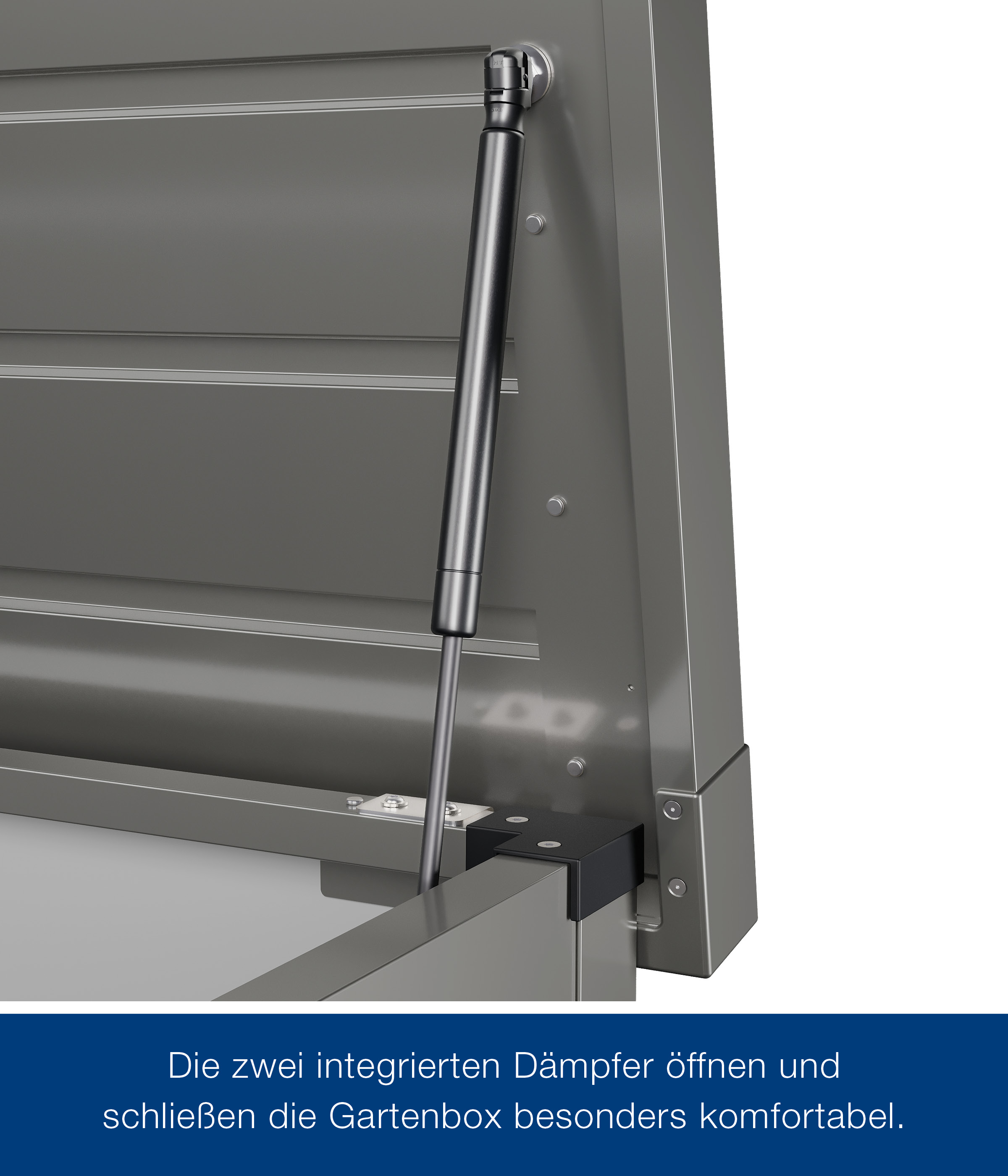 Außenmaße mit Deckel: 1.360×675×725 mm (B×T×H). RAL 9007 Graualuminium. Öffnen und Schließen dank zwei integrierten Dämpfern. Witterungsbeständig, regenwasserdicht und UV-beständig.