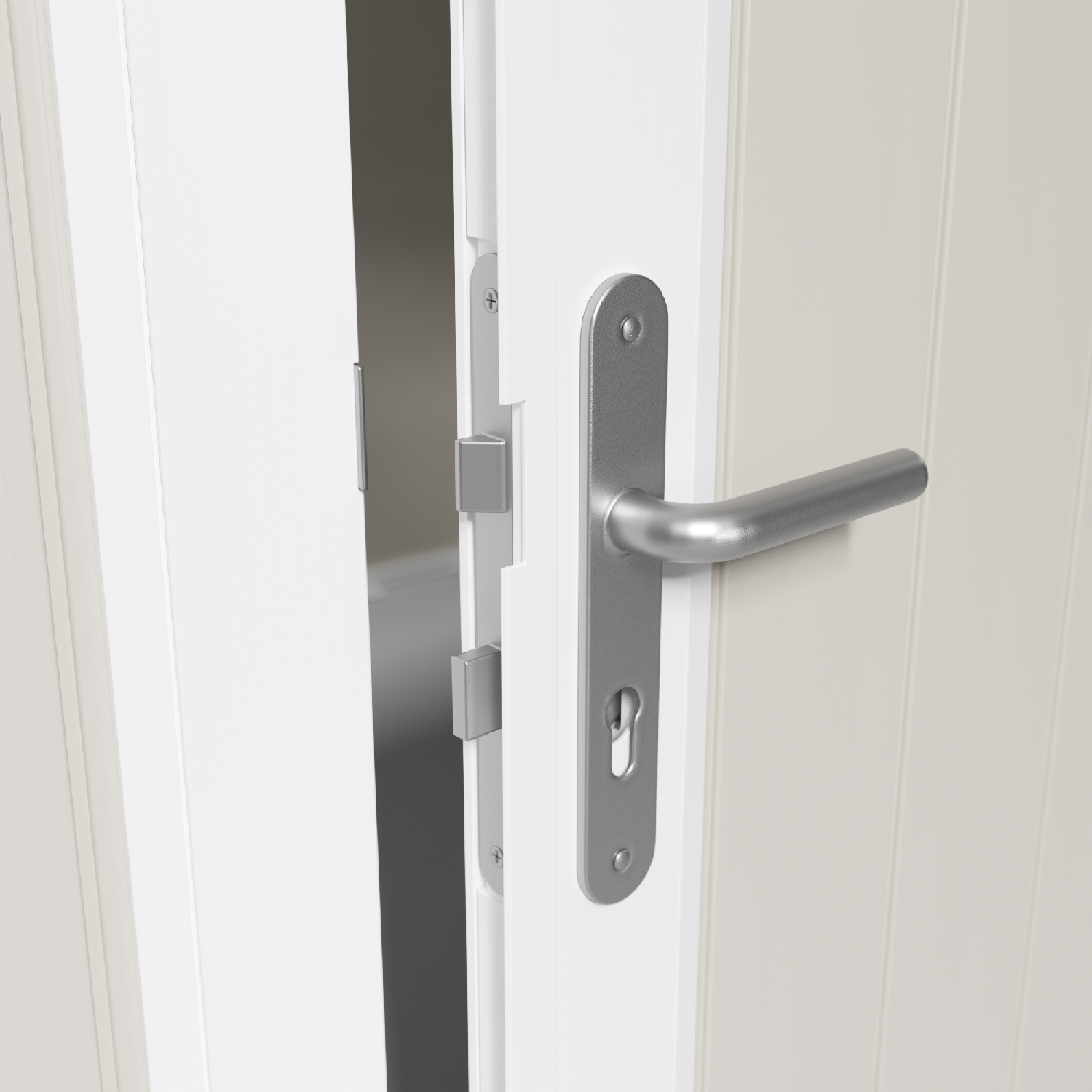 - Türausstattung: Drückergarnitur aus Edelstahl, BB-Schloss mit 2 Schlüsseln