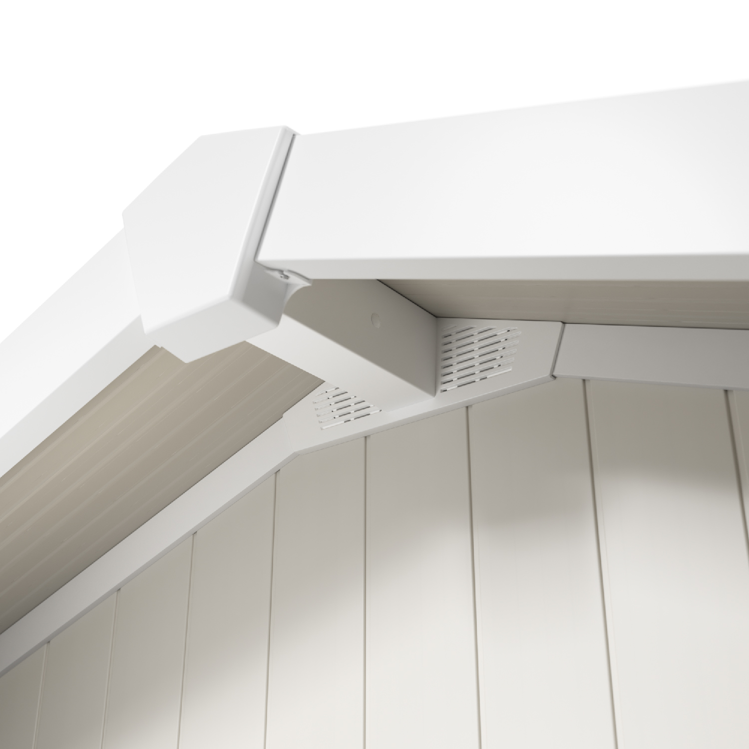 Das gleiche Material wird im Fensterbau verwendet. Das tragende Gerüst besteht aus stabilen, verzinkten Stahlprofilen. Alle Häuser werden komplett gegen UV-Strahlung behandelt. Dadurch verblassen Grosfillex Gartenhäuser nicht. Auf diese Weise besitzt jedes Haus einen Anti-UV-Schutz und eine lange Lebensdauer aufgrund einer hohen Farb- und Materialbeständigkeit. Für Schäden durch unzureichend befestigte Gartenhäuser kann keine Haftung übernommen werden.