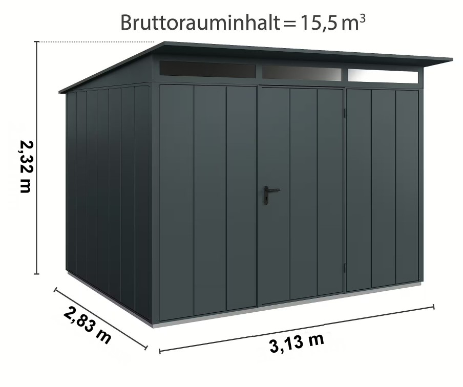 - Außenmaße mit Dachüberstand: 3127 × 2834 mm (BxT)