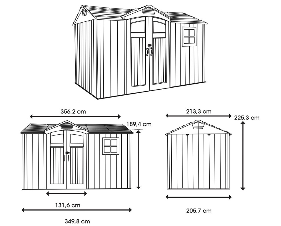 - Außenmaß inkl. Dachüberstand ca.: 350 x 206 x 225 (BxTxH) cm.
