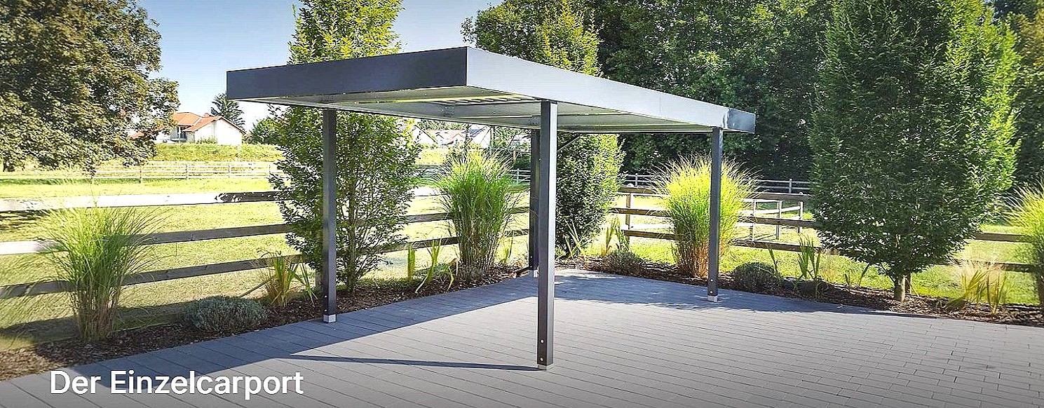 Schlanke Stützen und ein in Optik und Funktion genau abgestimmtes Dach. Mehr braucht es im Grunde genommen nicht, um ein Fahrzeug unterzustellen. Die Stützen sind in der Standardvariante hinten und vorne ca. 1,10 m eingerückt.