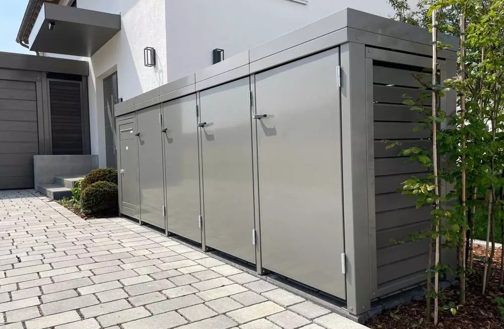 In der Modellvariante als Mülltonnenbox ist die Multibox mit speziellen Schienen zum Arretieren der Mülltonnen-Räder sowie mit einer Fangkette zum einfachen Befüllen der Müllbehälter ausgestattet.